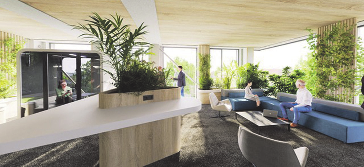 Neben zahlreichen Lounge-Areas gehören zum Konzept auch ein A-la-carte-Restaurant und ein Business-Restaurant, eine Café- und Cocktail-Lounge, ein High-Tech Mediaroom, ein multifunktionaler Konferenzbereich sowie ein Stateof-the-Art Fitness- und Spa-Bereich, der allen Mietern zur Verfügung steht. Das Büro für alle, die mehr in die Natur wollen.